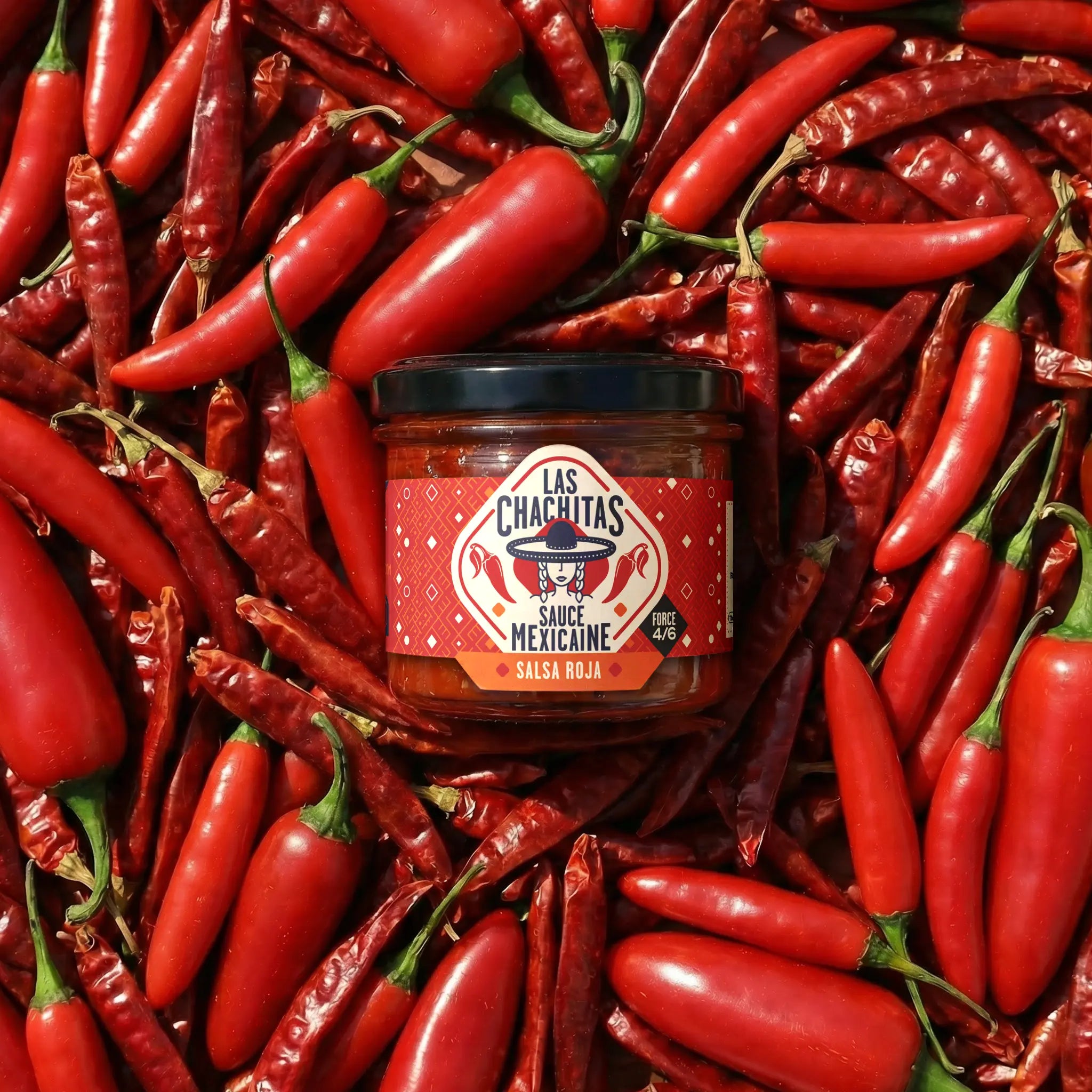 Salsa roja mexicana artesanal picante, elaborada en Francia con chiles serranos franceses y jalapeños rojos, chiles de árbol e ingredientes provenzales.